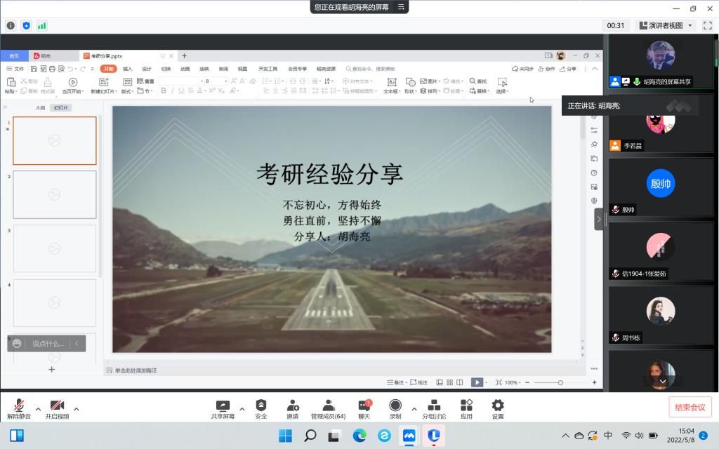 5月8日下午,w66旗舰厅通过腾讯会议平台,以直播方式开展线上考研经验交流会,旨在充分发挥优秀员工的先进模范带头作用,提高大家对考研的认识,掌握相关考研技巧,了解更多的考研信息。本次分享会特邀考研上岸同学胡海亮、王丽娜、李旭三名同学与大家交流分享考研经验,公司2019级、2020级同学全体参加。