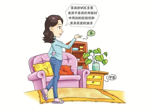 起居室中的新家具是最主要的VOCs排放源。家具所用板材中用到的胶黏剂和家具表面的油漆含有大量的有害物质,不断向室内释放,其中包括甲醛、苯、甲苯、乙苯、二甲苯、酮类等等。另外,一些电器及电子设备由于元器件使用了树脂和胶合剂,使用时在较高温度下也会释放部分VOCs。