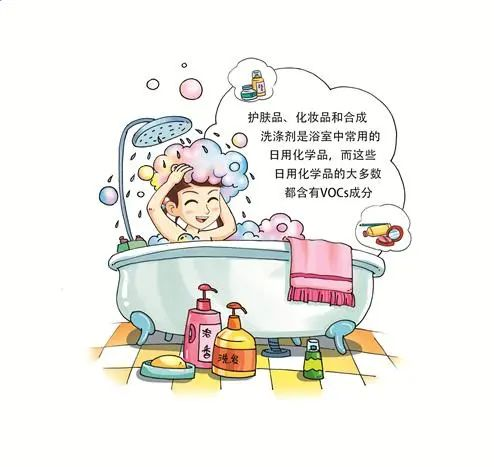 护肤品、化妆品和合成洗涤剂是浴室中常用的日用化学品,而这些日用化学品的大多数都含有VOCs成分,在使用过程中会挥发到空气中,污染物的主要类别为醇类和脂肪烃类。