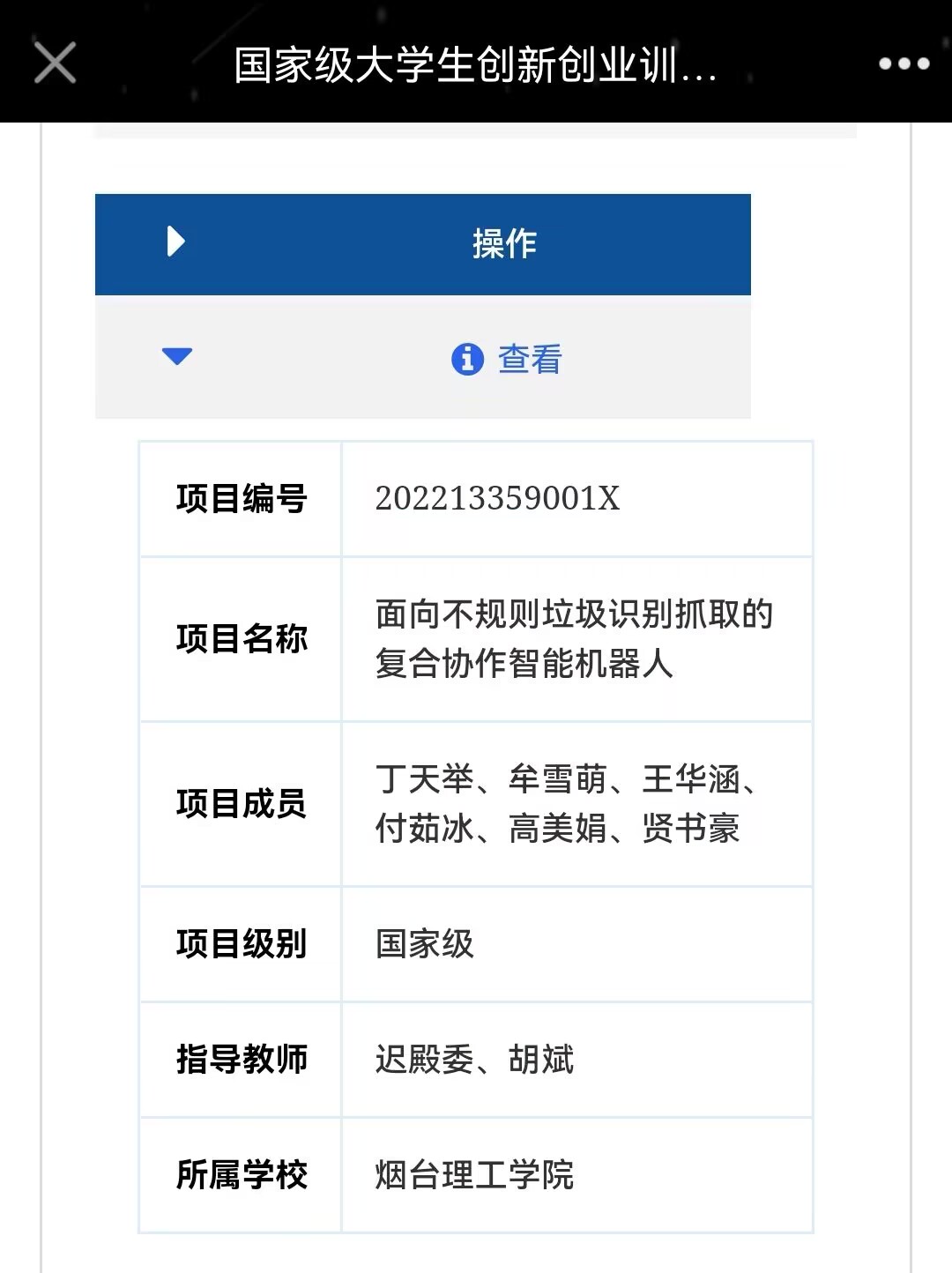 近日,根据《教育部高等教育司关于公布2022年国家级老员工创新创业训练计划项目和重点支持领域项目名单的通知》(教高司函〔2022〕10号),公司由胡斌、迟殿委老师指导的《面向不规则垃圾识别抓取的复合协作智能机器人》成为公司唯一一项成功入选山东省老员工创新创业训练计划项目。