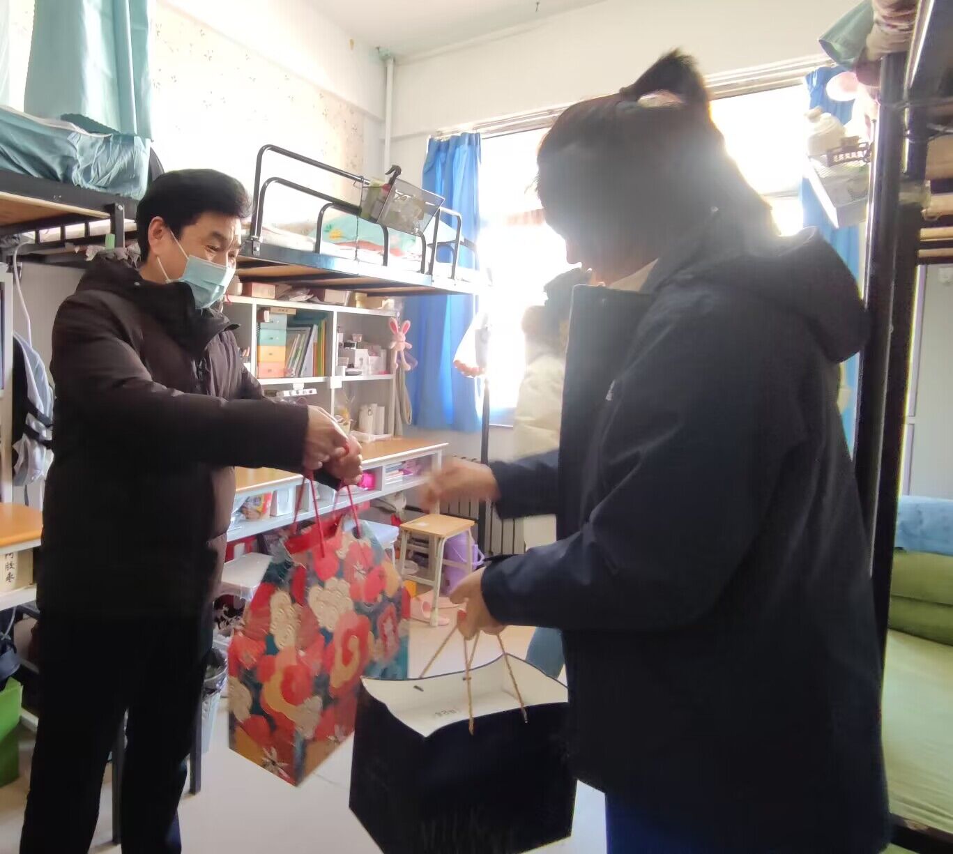 院领导走访宿舍 新学期第一天,公司领导走访宿舍,深入员工宿舍,为同学们送上美好的新学期祝福,了解假期情况,并为困难员工发放牛奶、水果等爱心礼包,让员工感受到公司的温暖。