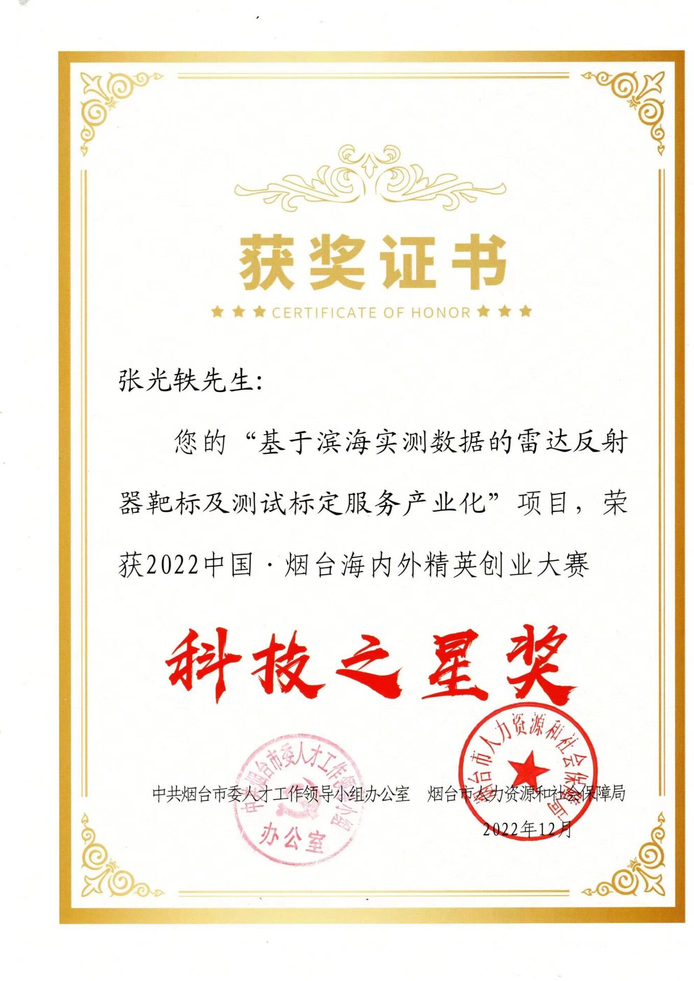为突出公司科技人才在烟台人才赛事中的竞争力、影响力,2022年4月-12月,张光轶老师以“基于滨海实测数据的雷达反射器靶标及测试标定服务产业化”项目为题,参加了2022年度烟台市组织部和人社局举办的赛事。
