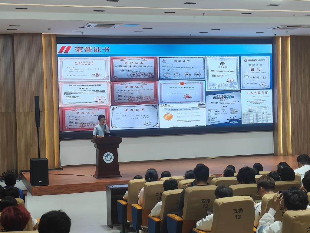 丁天举结合自身参赛经验,分享了参加学科竞赛的关键要点。首先是团队合作的重要性。在竞赛中,一个默契配合、优势互补的团队能够发挥出巨大的能量。不同专业背景的成员可以带来多元的视角和技能,共同攻克难题。其次是新思维的养成。他以自己在竞赛中的经历为例,讲述了如何通过创新思维解决了一个又一个棘手的问题。鼓励新生要敢于突破传统思维的束缚,大胆提出新的想法和解决方案。第三是要有坚持不懈的拼搏精神。丁天举坦言,竞赛过程中会遇到各种困难和挫折,但是只要有坚定的信念和不屈不挠的毅力,就一定能够克服困难。此外,丁天举还分享了一些具体的竞赛技巧如何进行项目选题、如何制定合理的计划以及如何有效地展示成果等。报告会现场气氛热烈,学弟学妹们认真聆听,积极参与互动。