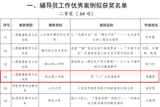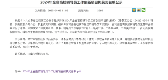 近日,山东省教育厅公布了全省高校辅导员工作创新项目评选结果。经组织推荐、资格审核、专家遴选等程序,公司项目获评2024年辅导员工作优秀案例二等奖,优秀“百问百答”微视频。