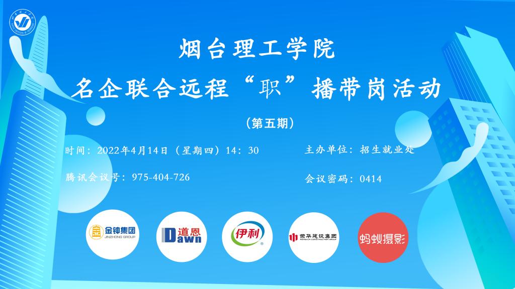 各位毕业生,公司第五期名企联合远程“职”播带岗活动将于4月14日(周四)下午14:30举行,邀请了荣华建设集团有限公司、道恩集团有限公司、烟台蚂蚁摄影信息咨询服务有限公司、山东金钟科技集团股份有限公司、浙江伊利乳业有限公司参加。