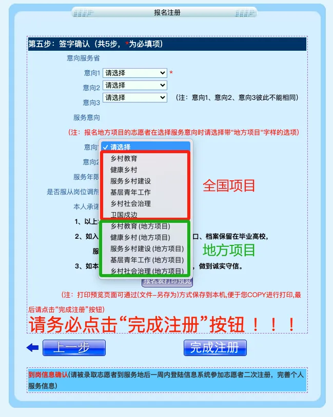 如果你想报名全国项目,请在选择岗位专项时选择不带有“地方项目”字样的选项。如果你想报名地方项目,请在选择岗位专项时选择带有“地方项目”字样的选项。