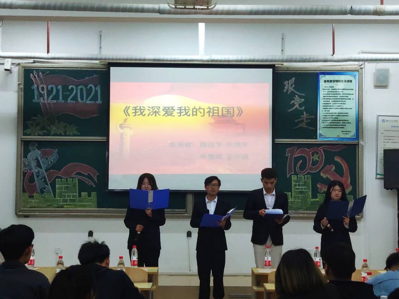 活动伊始,一段扣人心弦、慷慨激昂的视频《党的一百年》拉开了序幕。紧接着是铿锵有力、跌宕起伏的朗诵《祖国啊》,用无限的激情歌颂自强不息、团结统一的中华民族。歌曲《我的名字》充分调动同学们的参与热情,展示了同学们的文艺风采。接下来,各班团支部准备了有关党史的有奖答题环节,同学们的积极互动,同时将中国共产党的性质、宗旨、光辉历史,学习党的路线、方针政策和决议牢记于心。然后《放飞梦想》、《我深爱我的祖国》、《追梦赤子心》,掀起了诗歌朗诵的高潮,营造健康向上的氛围,深情回顾党的奋斗历史,讴歌党的光辉业绩。最后表演者激情澎湃的演讲《拥有梦想就要付诸实践》鼓舞了同学们努力实现个人梦想并付诸实践的决心,引领同学们树立积极向上的生活态度和永不服输的学习精神。诸多精彩节目,大大丰富了同学们的课余生活,增进了同学们之间的友情,促进了同学们之间的交流。