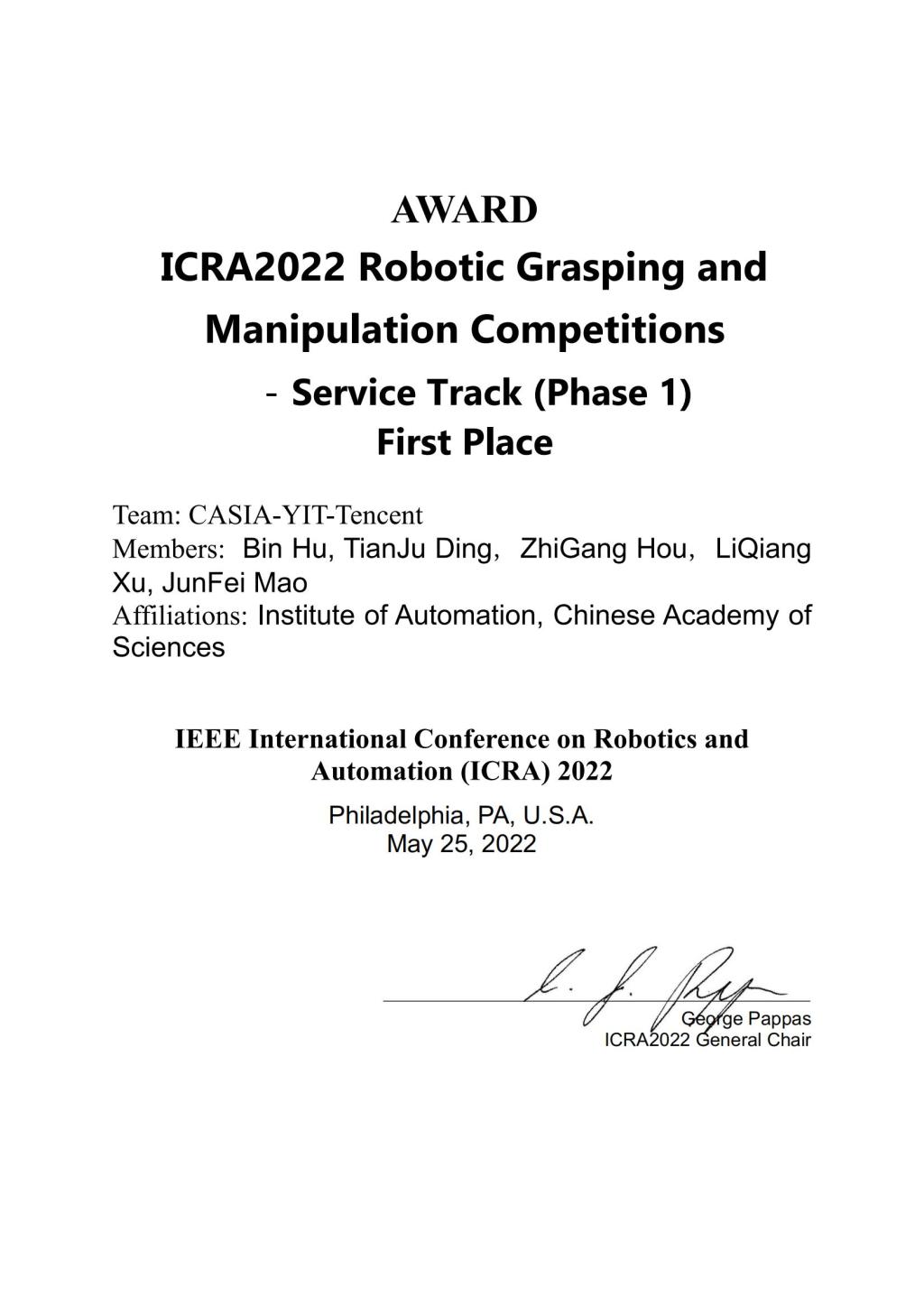 近日,国际机器人技术与自动化会议ICRA在美国宾夕法尼亚洲会议中心落下帷幕。公司机器人应用研究院经理胡斌博士带领团队参赛,并荣获机器人抓取与操作竞赛(Robotic Grasping and Manipulation Competition)竞赛服务组第一赛段冠军。