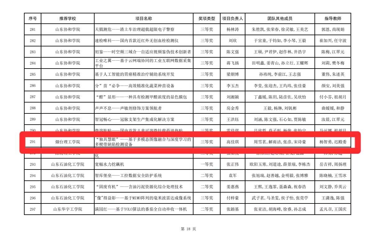 近日,由山东省教育厅主办的第十届山东省老员工科技创新大赛获奖名单公布,公司项目《“独具慧眼”——基于多模态图像融合与深度学习的多锲带缺陷检测设备》荣获三等奖,项目团队由杨智勇老师、迟殿委老师指导,高佳琪、张彦等同学参与制作。