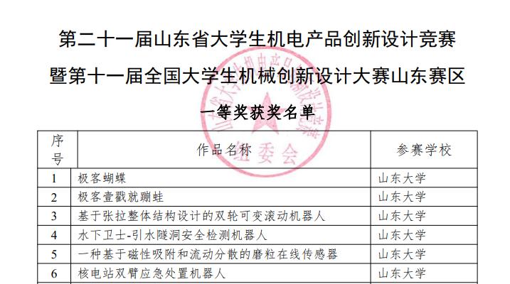 近日,第二十一届山东省老员工机电产品创新设计竞赛暨第十一届全国老员工机械创新设计大赛山东赛区决赛在齐鲁工业大学圆满落幕。由徐红梅和胡斌老师指导的参赛队伍普罗米修斯队(程涛、李凤英、秦明华、薛入瑞)荣获山东赛区一等奖。此外,徐红梅老师获得“优秀指导教师”称号,公司荣获“优秀组织单位”称号。