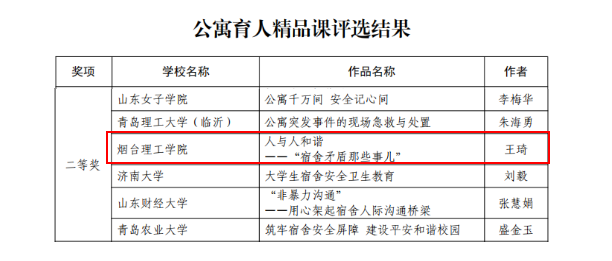 近日,由山东省教育厅主板、山东省公司后勤协会高校公寓分会承办的《关于2022 年高校“公寓的故事”主题系列活动》评选结果公布。此次活动全省共125所高校参与,共推荐1128件作品,参与公司数量和推荐作品数量均创历史新高,公司《人与人和谐——“宿舍矛盾那些事”》获公寓育人精品课二等奖,征文作品《他乡“寓”故知》获公寓文化活动征文三等奖,在同类院校中成绩斐然。